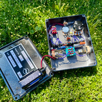 Green Machine is a point to point take on the Germanium Fuzz Face, with a few modifications. Controls from left to right are - Volume, Bias, and Gate. VOLUME is output level control and a battery bypass switch. When turned all the way counter clockwise, the battery is disconnected from the circuit. Very handy when operating with just the internal 9v battery to save battery life. BIAS changes the character of the fuzz and also helps dial in a great tone with low battery, or when it gets too hot. The GATE toggle switch tweaks the feedback network and caused the fuzz to gate and glitch. This will be most noticeable when the bias control is clockwise past half rotation.